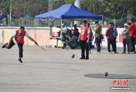 图为比赛中守方选手旋放陀螺。 黄兴鸿 摄