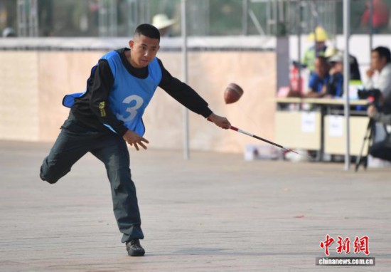 图为比赛中攻方选手抛掷陀螺。 黄兴鸿 摄