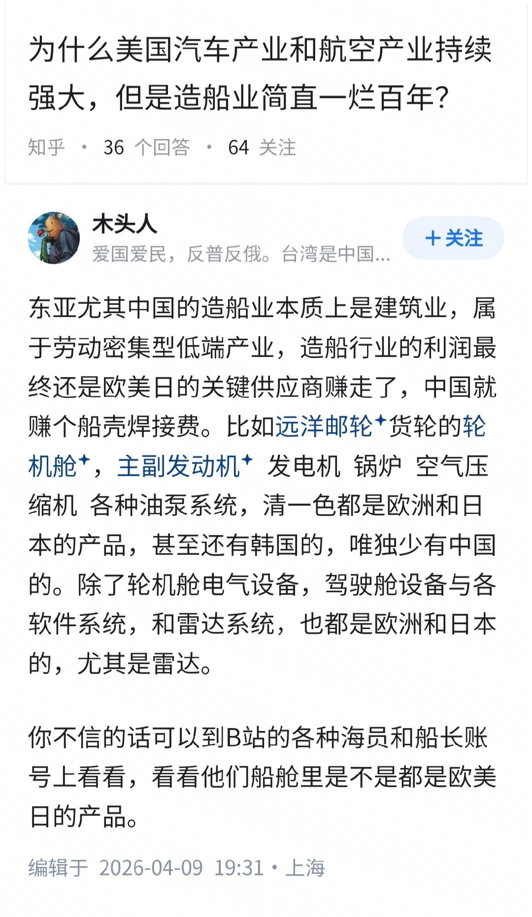 该回答的主要意思就是说:这些年中国造船业全球第一,看起来很“高端制造”,但换个角度看,它更像一个超级建筑业,本质上还是靠工程组织和人力堆出来的行业。